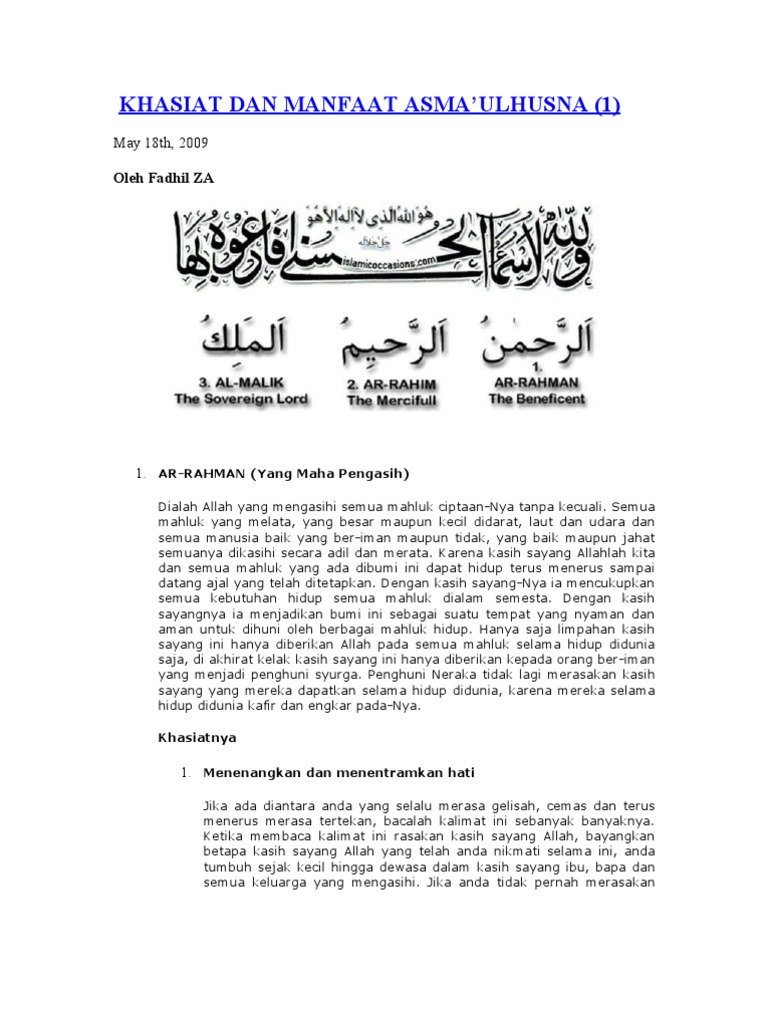 Ini merupakan sanjungan untuk allah 3. Selain itu juga dapat digunakan untuk hajat atau membantu menyembuhan penyakit. الله ( ya allah ) : Allah swt berfirman dalam al quran dan memerintahkan kepada nabi muhammad saw untuk mengucapkan / berdzikir dengan menyebut nama khasiat, fadhilah dan keutamaan asmaul husna dalam dzikir. Dilebur dengan air dan diminumkan kepada orang.