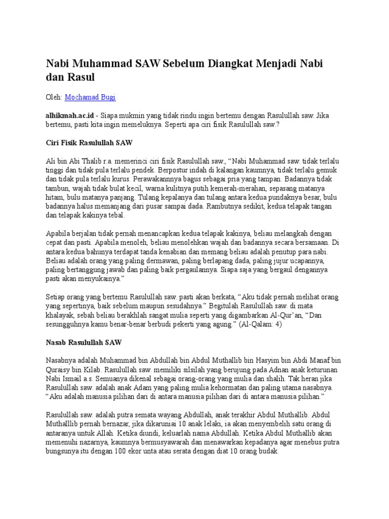 Keturunan nabi bijak mentadbir makkah dan bijak berniaga. Perlu kami sampaikan sebelumnya bahwa dalam sejarah dan dokumen islam, tidak kami temukan sesuatu yang menyampaikan masalah ini secara jelas. Nabi muhammad berasal daripada keturunan pemimpin makkah yang terkenal, iaitu qusai bin kilab. Dengan turunya wahyu tersebut, muhammad telah resmi menjadi seorang nabi dan rasul. Beliau merenungkan keadaan dan penciptaan dirinya. Seperti apa ciri fisik rasulullah saw.? Perang yang terjadi pada masa nabi muhammad saw terbagi atas ghazwah (gazwah) dan sariyah (sariyyah). Nabi muhammad diangkat menjadi nabi. Apakah nabi muhammad memiliki keturunan? Keluarga nabi mengusai makkah, kaabah, telaga zamzam. Apakah muhammad sebelum pengutusan nabi berpegang pada suatu agama dan syariat, ataukah tidak? Sifat shiddiq ini dilakukan bukan hanya setelah beliau diangkat menjadi rasul, namun jauh sebelumnya beliau. Pekerjaan itulah yang membuat beliau sering merenung dan berfikir.